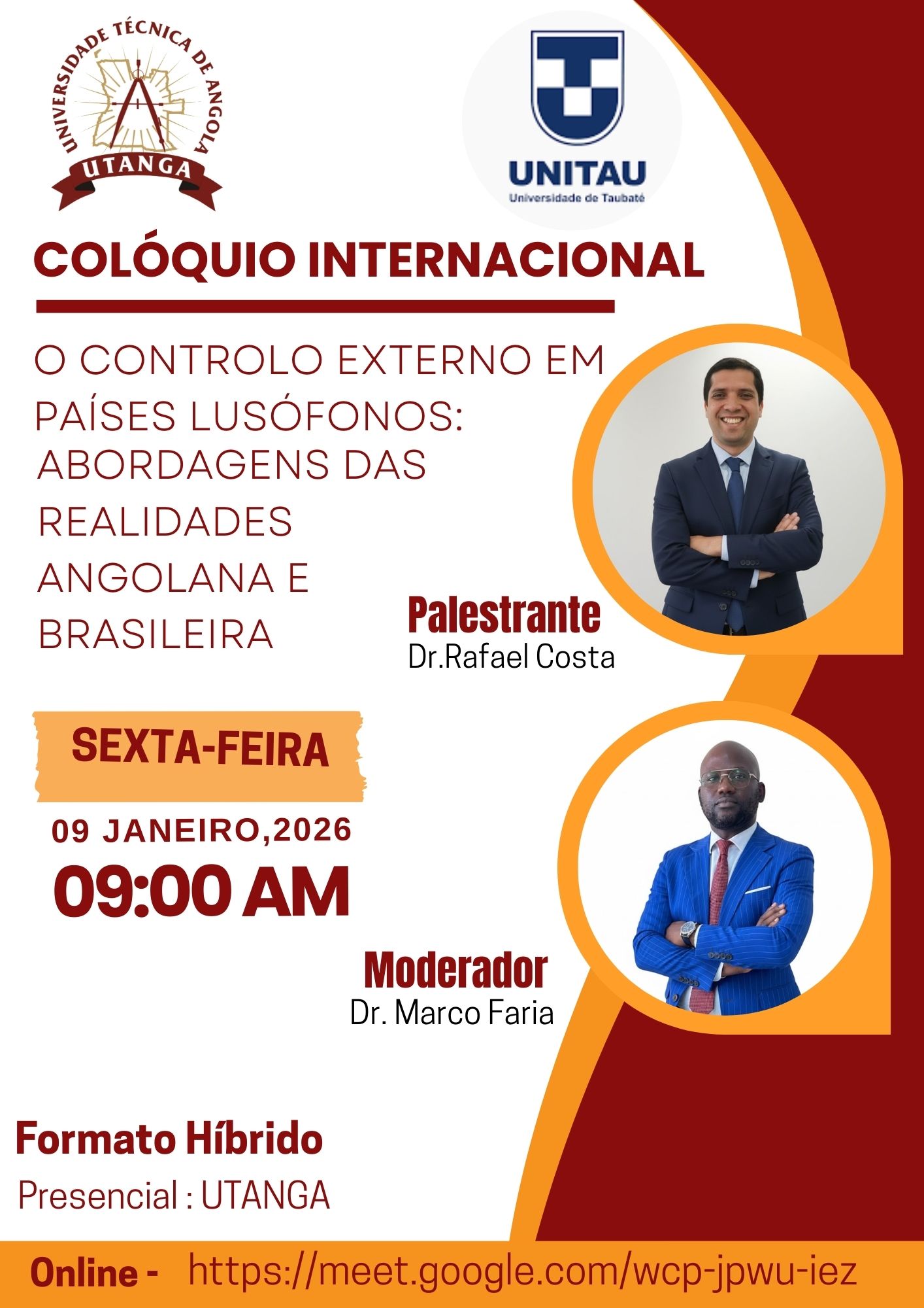 A Universidade Técnica de Angola (UTANGA), em parceria com a Universidade de Taubaté (UNITAU – Brasil), promove, no dia 09 de Janeiro de 2026, às 09h00, o Colóquio Internacional subordinado ao tema “O Controlo Externo nos Países Lusófonos: Abordagens das Realidades Angolana e Brasileira”.